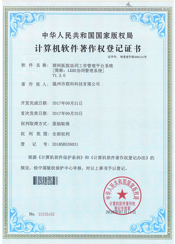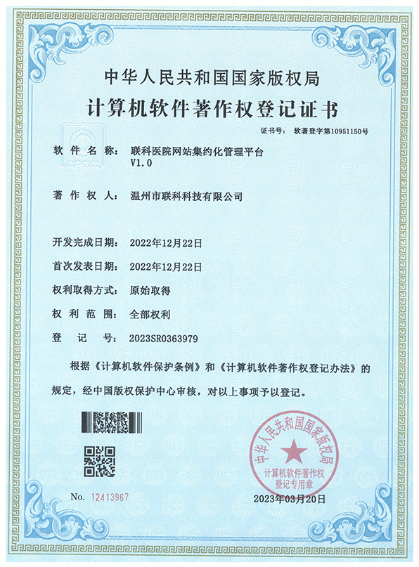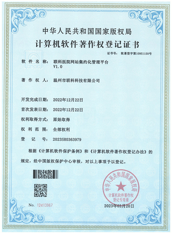 聯科醫院網站集約化管理平臺V1.0登記證書(2022R11L2489282)