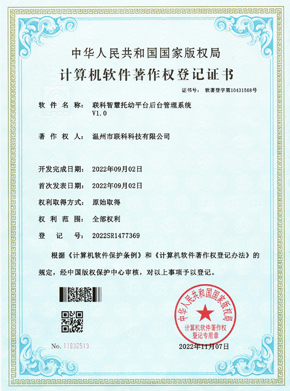聯科智慧托幼平臺老師客戶端軟件V1.0登記證書(2022R11L2332140)