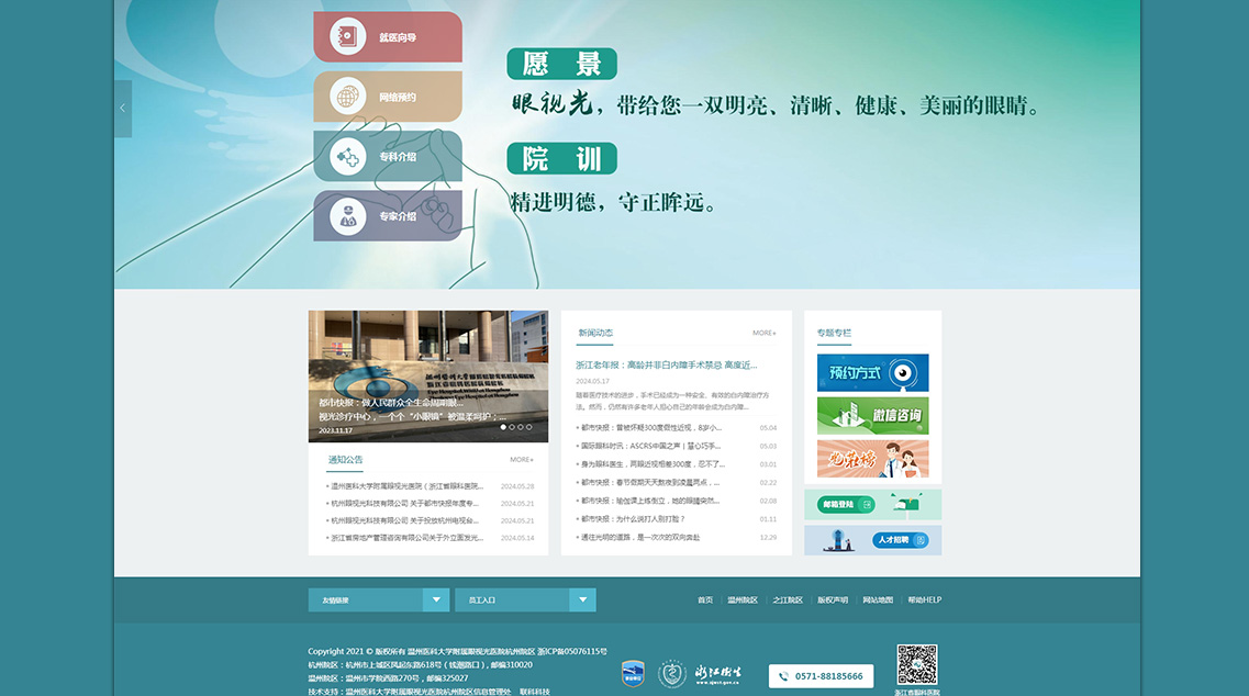 溫州醫(yī)科大學(xué)附屬眼視光醫(yī)院成立于1998年,2009年經(jīng)省衛(wèi)生廳批準增掛“浙江省眼科醫(yī)院”,2010年開設(shè)杭州院區(qū),是浙江省首家三級甲等眼科專科醫(yī)院。醫(yī)院承擔臨床醫(yī)療、醫(yī)學(xué)教育、醫(yī)學(xué)科研、預(yù)防保健等任務(wù),是國家眼部疾病臨床醫(yī)學(xué)研究中心、眼視光學(xué)和視覺科學(xué)國家重點實驗室、國家眼視光工程技術(shù)研究中心、國家藥監(jiān)局眼科疾病醫(yī)療器械和藥物臨床研究與評價重點實驗室,以及國家眼科學(xué)臨床重點專科、教育部近視防控與診治工程研究中心。