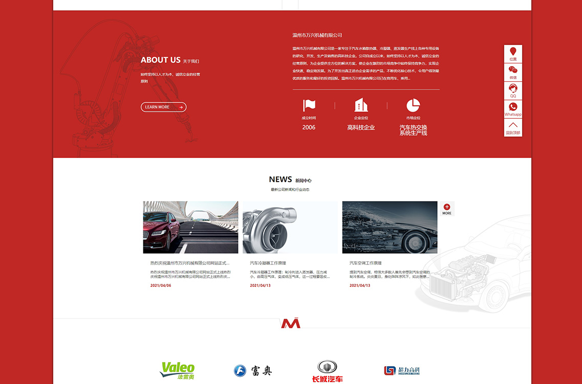 溫州市萬興機械有限公司是一家專注于汽車水箱散熱器、冷凝器、蒸發器生產線上各種專用設備的研究、開發、生產及銷售的高科技企業。公司自成立以來,始終堅持以人才為本、誠信立業的經營原則,為企業提供全方位的解決方案,使企業在激烈的市場競爭中始終保持競爭力,實現企業快速、穩定地發展。為了開發出真正適合企業需求的產品,不斷優化核心技術,令用戶得到優質的服務和好的投資回報。