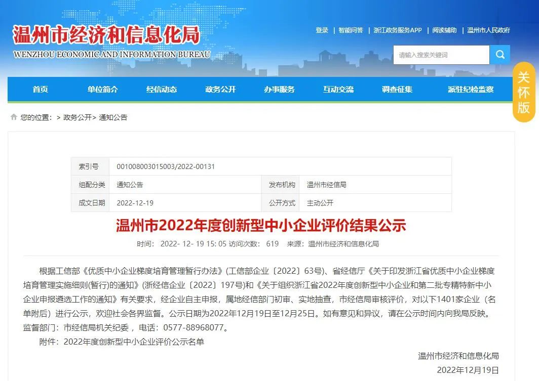 根據溫州市經濟和信息化局于2022年12月19日發布的《溫州市2022年度創新型中小企業評價結果公示》顯示,溫州市聯科科技有限公司成功入選2022年度溫州市創新型中小企業名單。