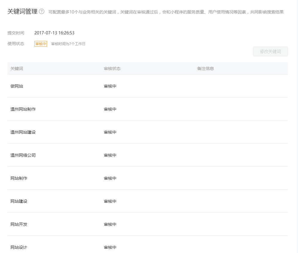 由于小程序關鍵字個數有限,只能添加10個,建議一次性添加齊全,畢竟有7天的審核日期,而且規定是和小程序業務相關詞才能通過。