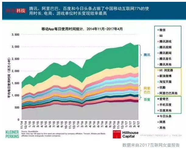 據2017互聯網女皇報告稱,中國用戶平均每天投入到移動應用的時間為大約31億小時,投入到微信的時間約為9億小時。QQ、百度的愛奇藝、阿里巴巴的UC瀏覽器和微博等移動應用的使用時間均排在微信之后。